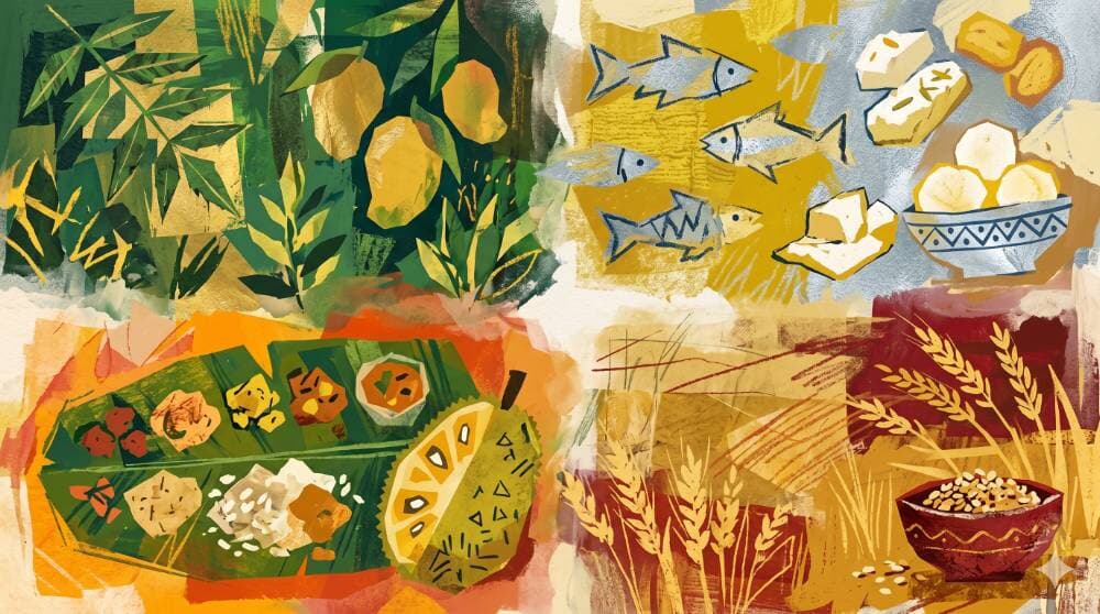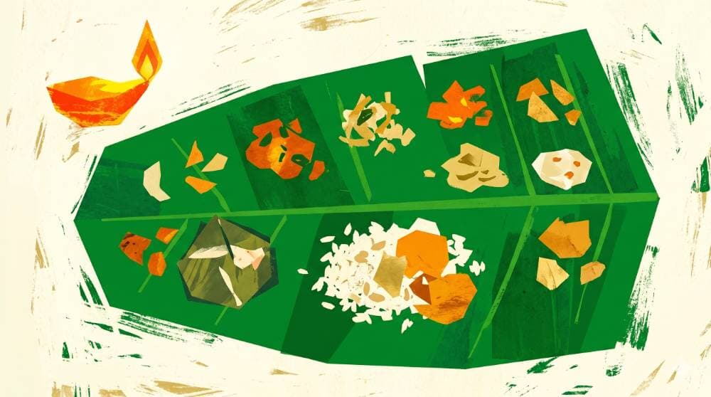 The sadya that follows is intentional in every element. Avial for abundance. Olan for calm. In Malabar, crispy Ayakoora and Varutaracha chicken curry join the banana leaf. And in one Kannur kitchen, a mother once made Kumbalappam — rice, jaggery, and coconut wrapped in jackfruit leaves and steamed — a flavour that belongs, now, only to memory.